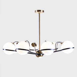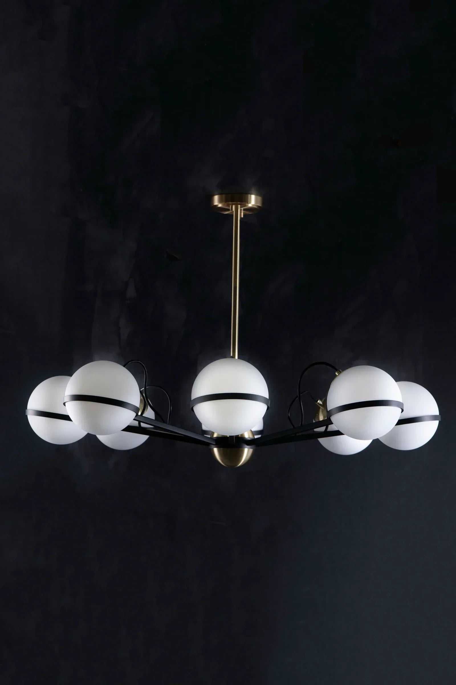 - Materials: Satin-brass frame, matte-black accents, 8 milk-glass globes.