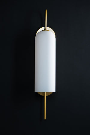 - Materials: Satin-brass back-plate + hand-blown frosted opal glass diffuser.