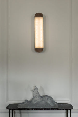 The Phan polished alabaster wall sconce provides soft illumination, with a clean, modern design that adds warmth and elegance to any space.